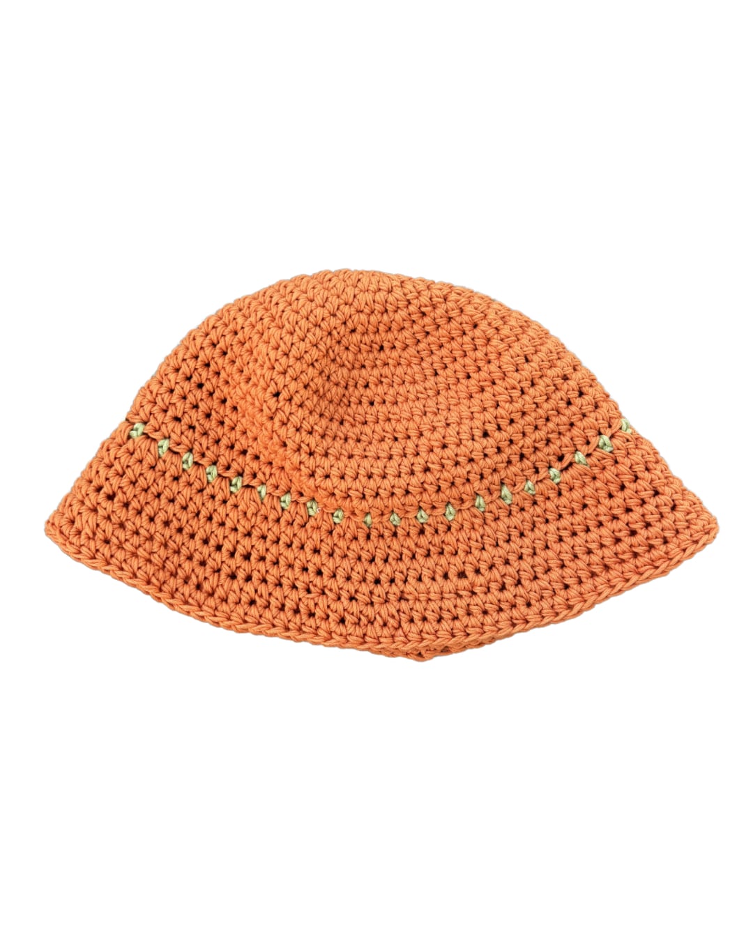 オレンジカラーに黄緑色のラインが入ったクロシェハットです。