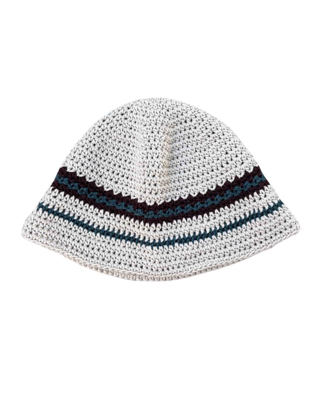 グレージュカラーにブラウンと深緑色のラインが入ったクロシェハットです。