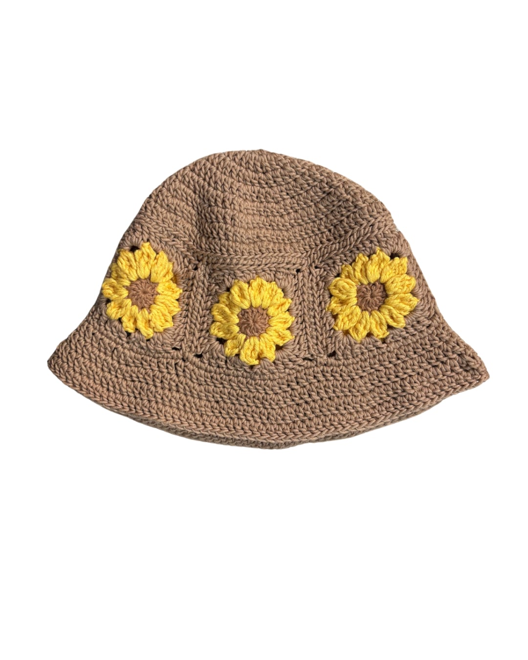 少し濃いめのキャメルカラーベースのデイジーの花が入ったクロシェハットです。